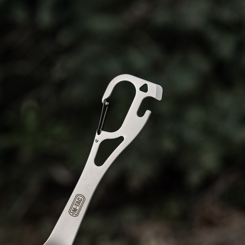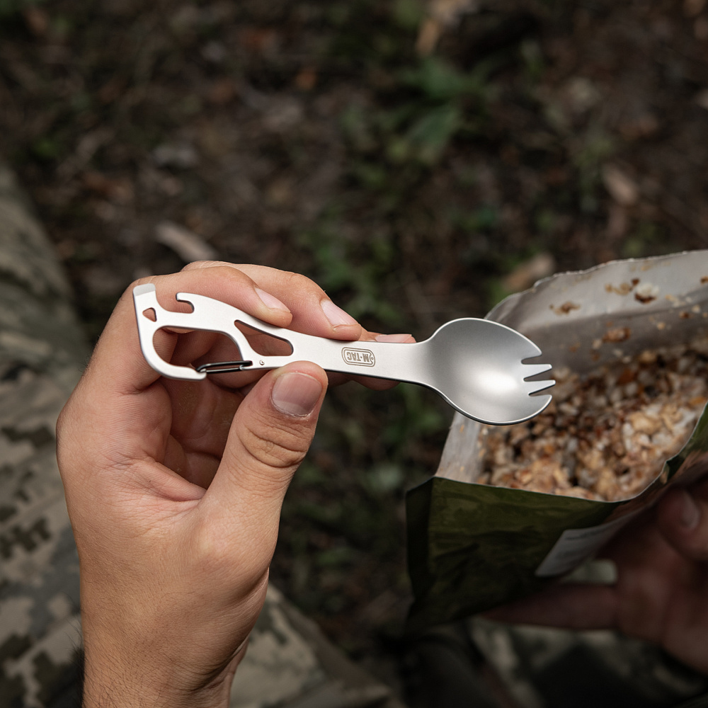 Łyżko-widelec M-Tac to funkcjonalne połączenie dwóch sztućców w jednym lekkim narzędziu. Dzięki kompaktowej formie i dołączonemu karabińczykowi możesz go przypiąć do plecaka, torby albo paska i mieć zawsze pod ręką podczas wypraw, biwaków czy w pracy w terenie. Wykonany ze stali nierdzewnej, jest odporny na uszkodzenia i łatwy do utrzymania w czystości.